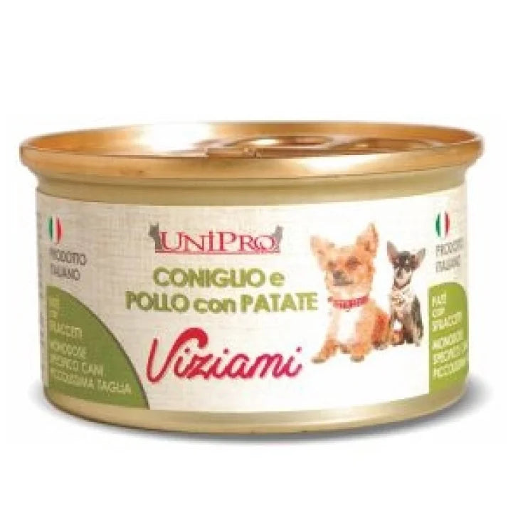 UniPro Viziami è un alimento specifico per cani di piccolissima taglia, assortito con ricette prelibatissime di patè con sfilaccetti.