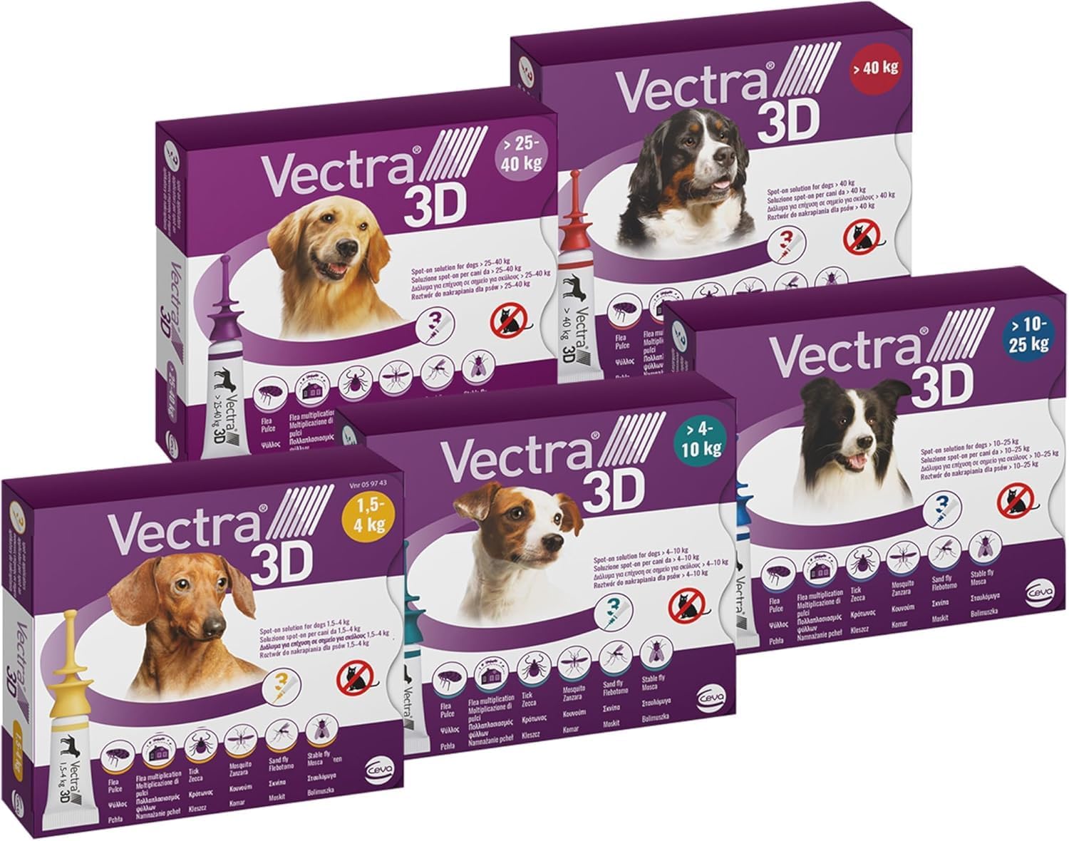 - VECTRA® 3D è disponibile in 5 dosaggi differenti in base al peso corporeo del tuo cane.
