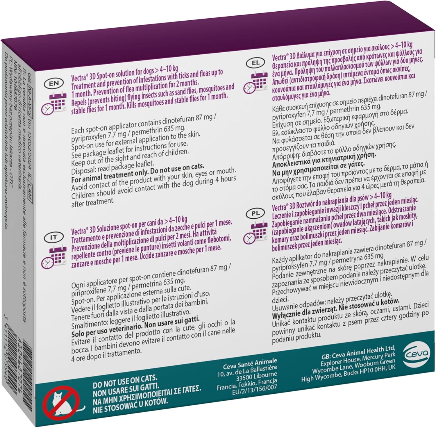 - contro le mosche. Vectra 3D ha azione repellente ed insetticida contro le mosche e, dopo l'applicazione, protegge dalle punture delle mosche per 1 mese.